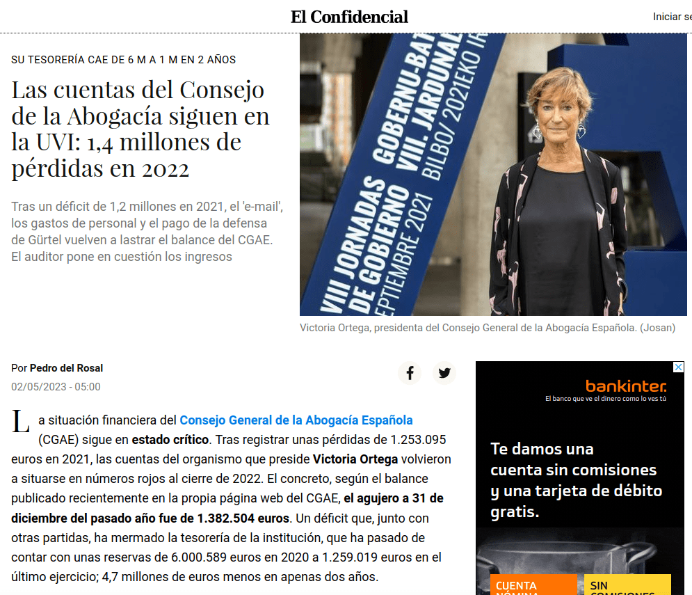 Y ahora por la prensa sabemos que a nadie se le oculta ya tampoco que la presidenta de la abogacía española está sumiendo al Consejo General de la Abogacía Española que acabaremos pagando todos los abogados y abogadas de España.
